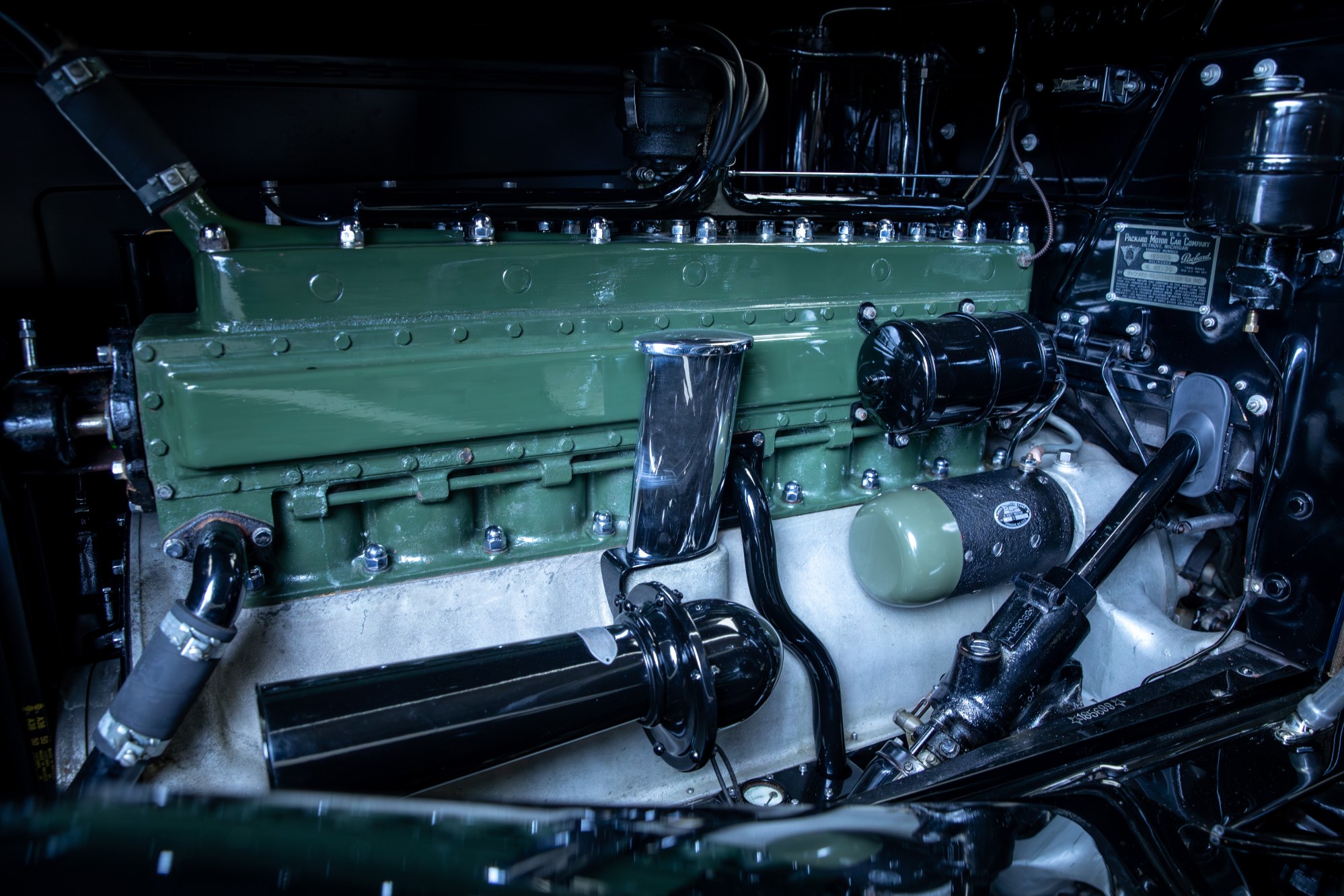 A commanding Packard, it is equipped with a host of desirable beauty items and accessories such as dual Pilot Ray lights, a radiator stone guard, dual side-mounted spares with mirrors, dual cowl lights, wind wings, a trunk rack, and chrome wire wheels. Under the hood, the 384-cubic-inch L-head eight-cylinder engine is dialed in making this Packard a proper and sporting example to thoroughly enjoy on noted tours and at events around the globe.